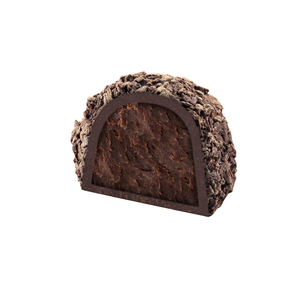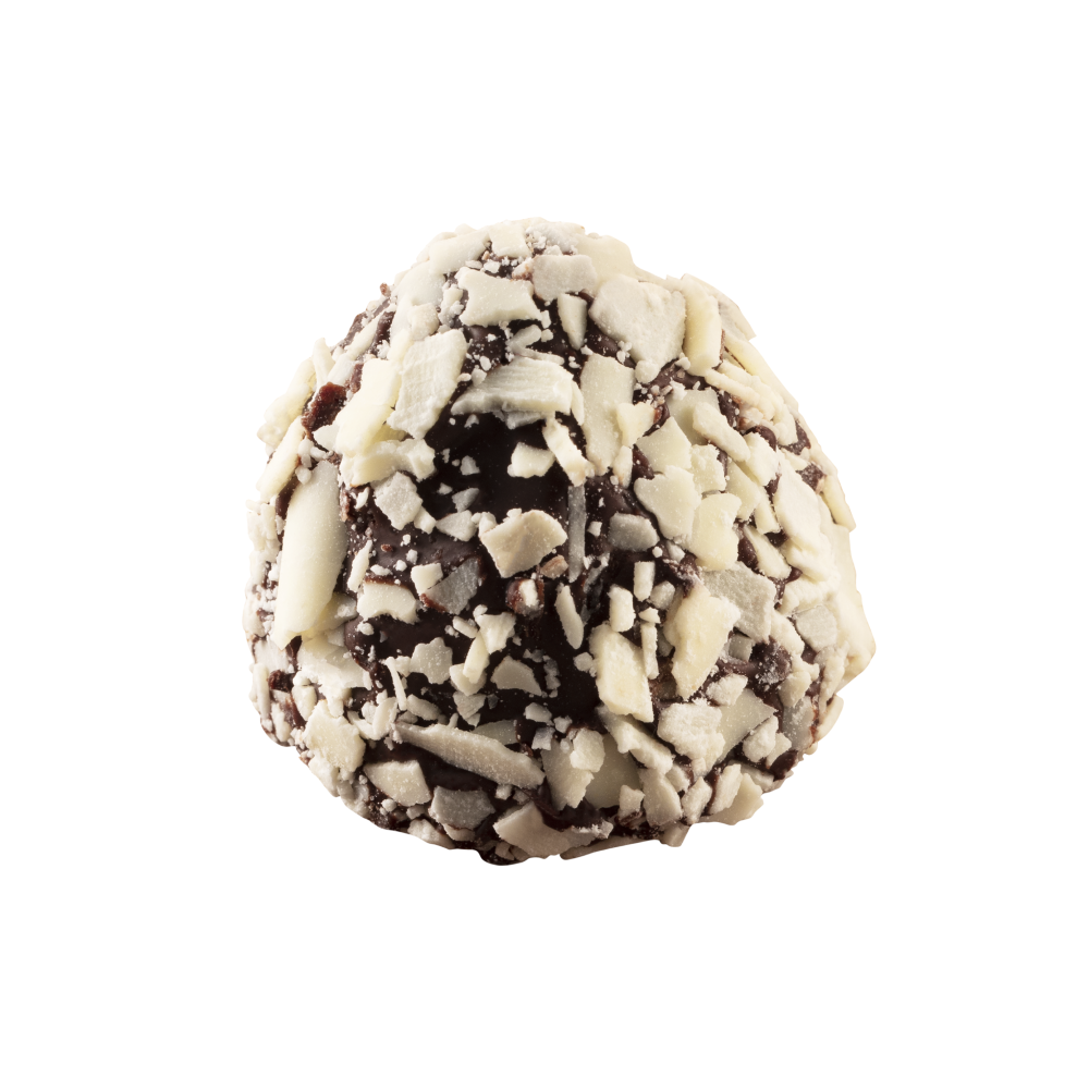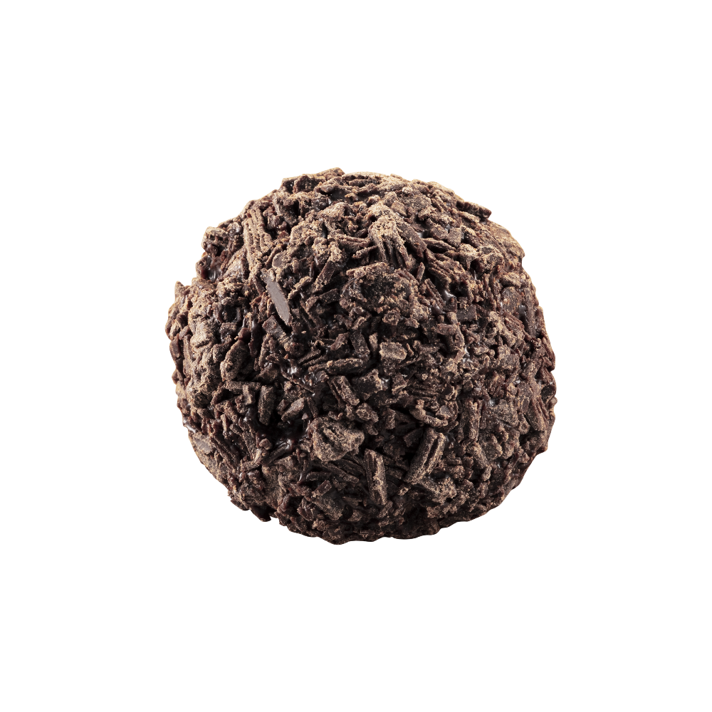 Extra dark chocolate butter cream in a dark chocolate shell and rolled in dark chocolate flakes.