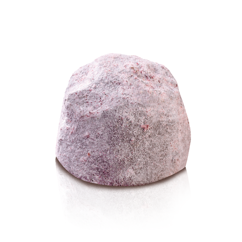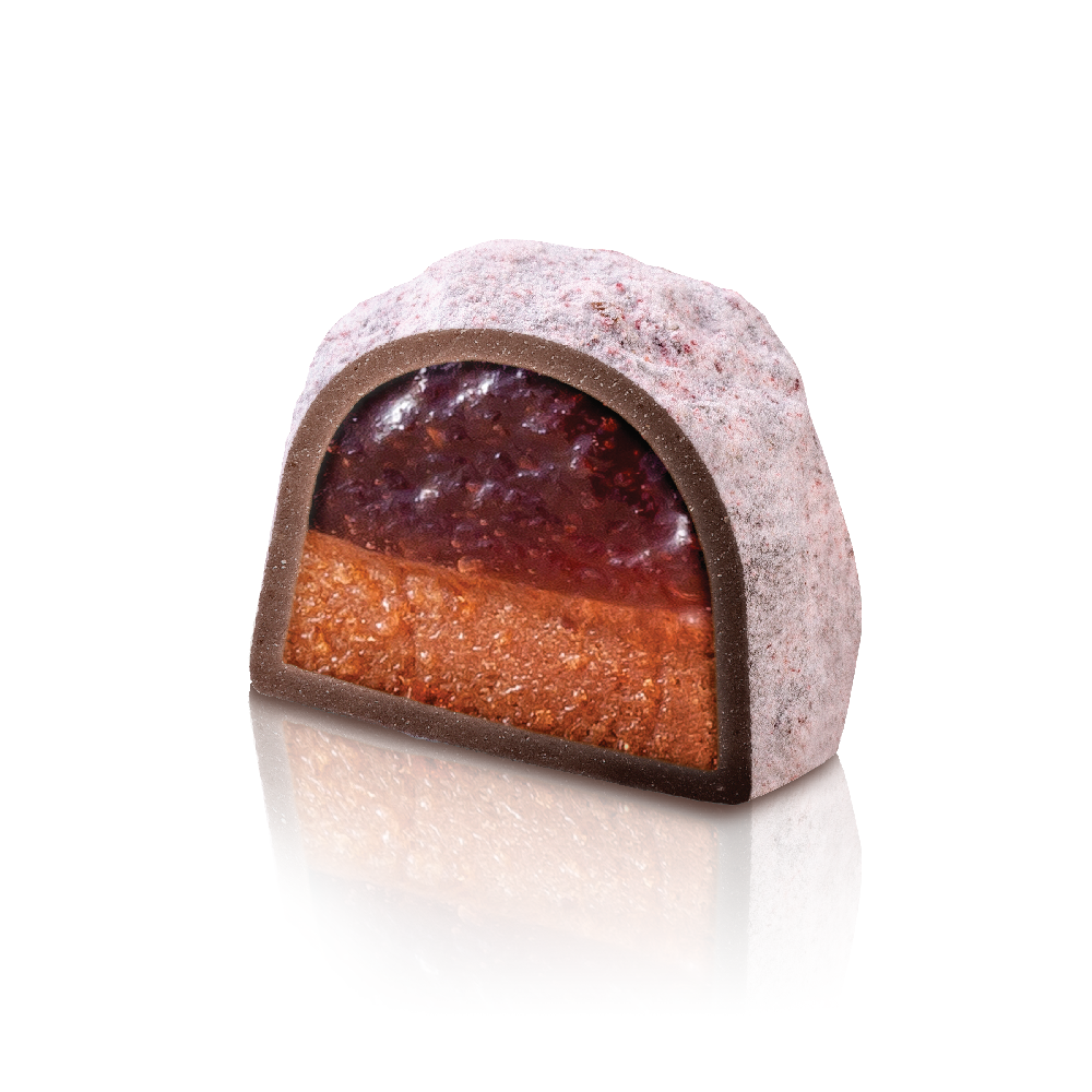 Layers of dark chocolate mousse and raspberry purée; enrobed in dark chocolate and rolled in sugar icing and raspberry powder.