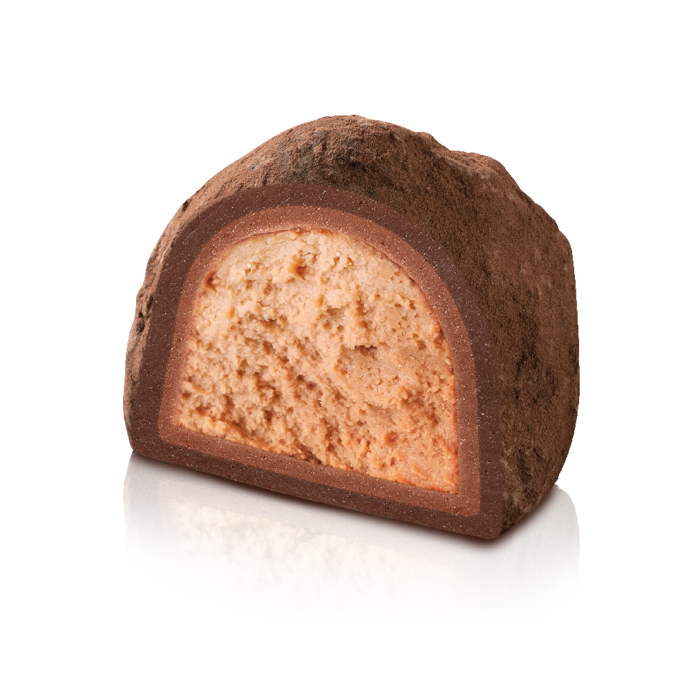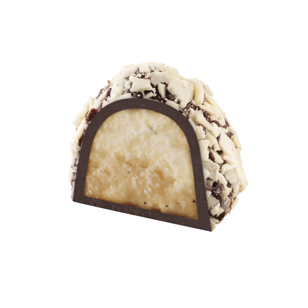 Smooth honey ganache with light vanilla mousse, covered in dark chocolate and surrounded by creamy white chocolate flakes.